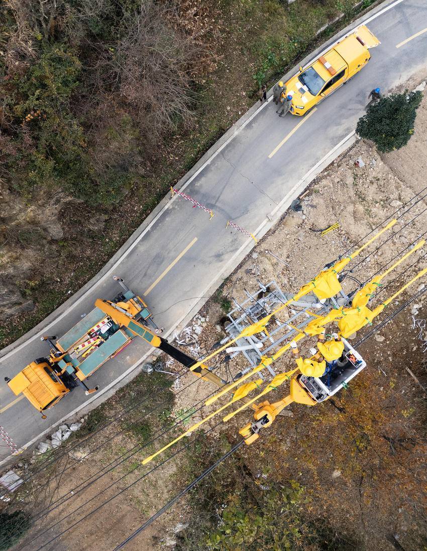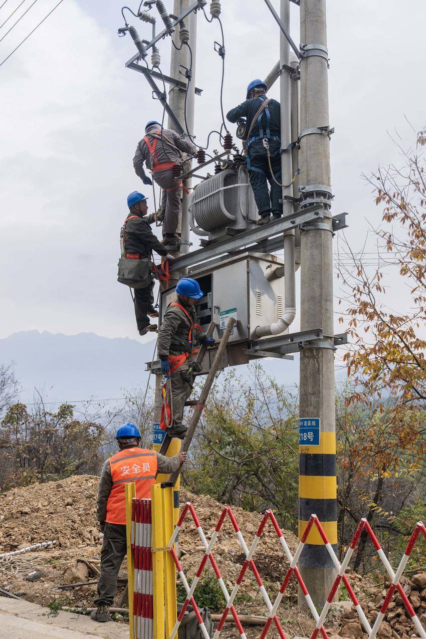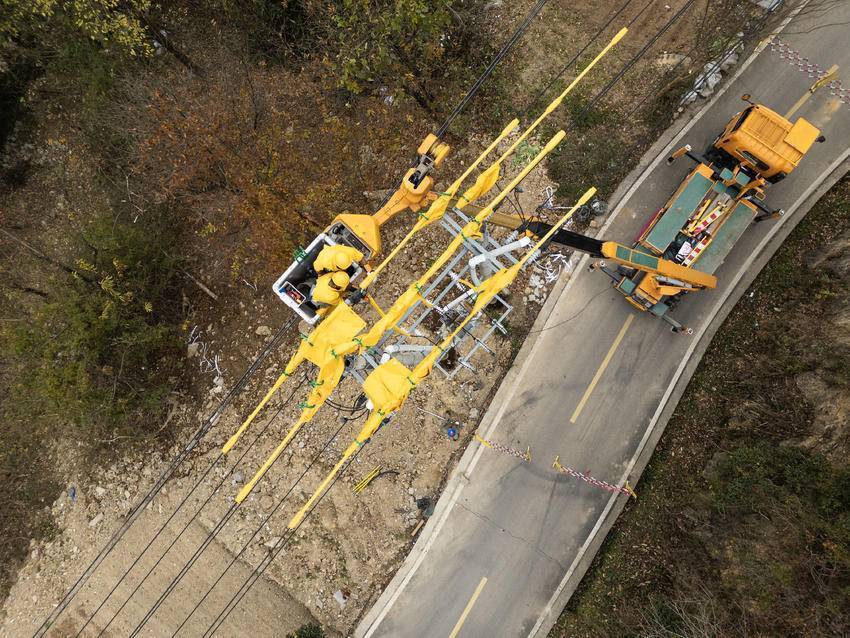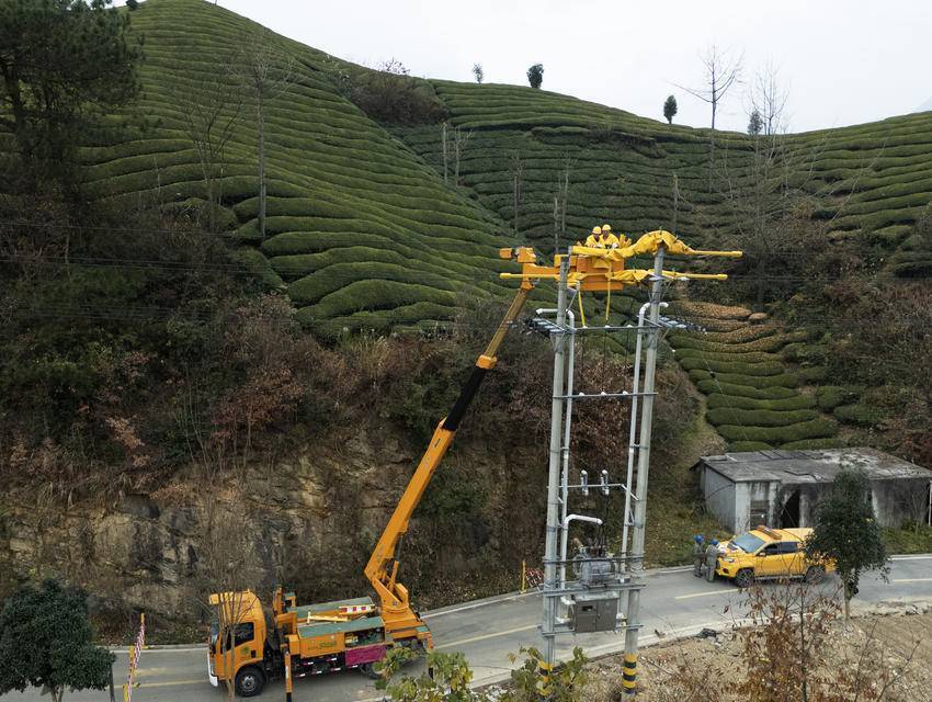 湖北日报客户端讯(通讯员 覃涛)12月10日,在鹤峰县走马镇升子村木耳山茶叶生产基地,吊车舞动、机器轰鸣。电力施工人员正在带电作业校正10千伏走高线100#台区水泥电杆,将原50千伏安变压器增容为200千伏安变压器。