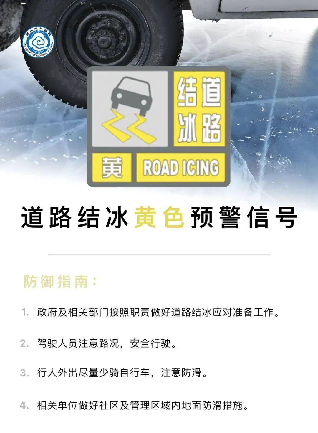 郑州市气象台2025年12月12日8时45分发布道路结冰黄色预警信号:受降雪和低温影响,预计未来24小时内,郑州市主城区、航空港区、上街区所辖乡镇及街道路表温度低于0℃,将出现对交通有较大影响的道路结冰,请注意防范。